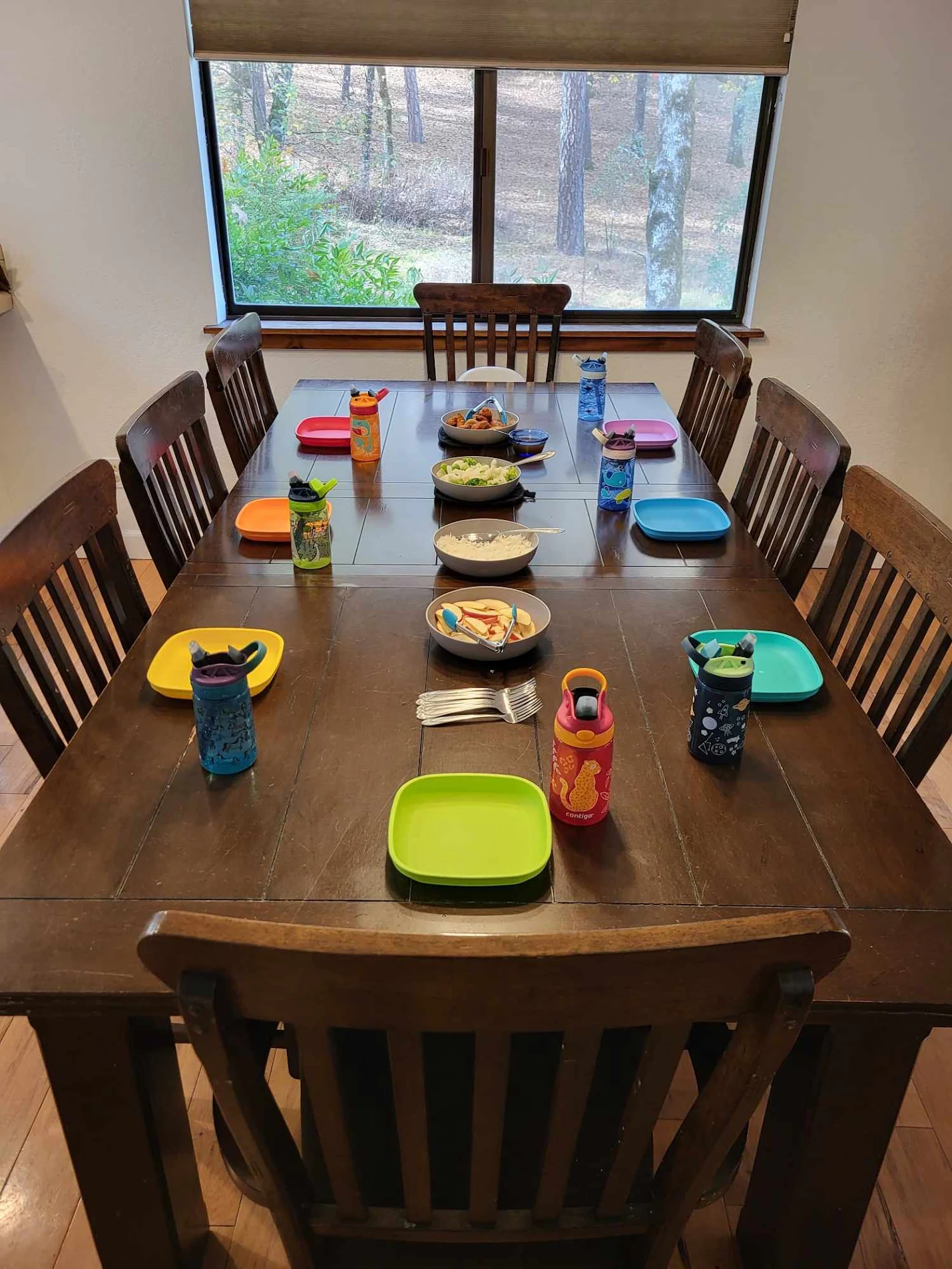 At Forest Friends Playschool we serve food family style. This empowers the children to feel like they have some say in what goes on their plate. We do still encourage them to try everything! Family style also helps with table manners, and fine motor skills. We regularly hear “Please pass the broccoli!” and “Could you please pass this to X?” The kids practice hand-eye coordination, learn to use spoons to scoop, and small tongs to grab. They also learn how much food to take both in relation to how much food is left for others in the serving bowl, and how much food they are actually hungry for.